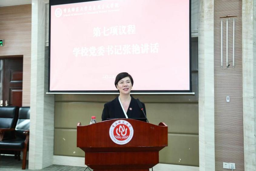 会议第七项议程,学校党委书记张艳讲话。张艳书记首先对同学们的信任支持、导师们的悉心指导以及学院的精心组织表达了诚挚感谢。随后,她着重强调学院师生应进一步坚定学校自信、学术自信与学科自信,凝聚起推动学院发展的强大精神力量。最后,张艳书记对全体新生提出四点要求:一是方向要正确,始终与国家战略同频共振;二是思维要科学,要做到理性、开放;三是本领要过硬,在实践锤炼中提升专业能力;四是行动要有底,恪守学术道德与职业操守。最后,她向与会师生致以衷心祝福,愿大家在学术道路上勇攀高峰,在人生征程中收获幸福。