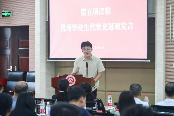 优秀毕业生代表龙冠雨结合三年求学历程,以“静心、坚持、勇敢、坦诚”四个关键词分享成长感悟,希望同学们以此为指引,在研究生学习阶段稳步前行,实现高质量发展目标。