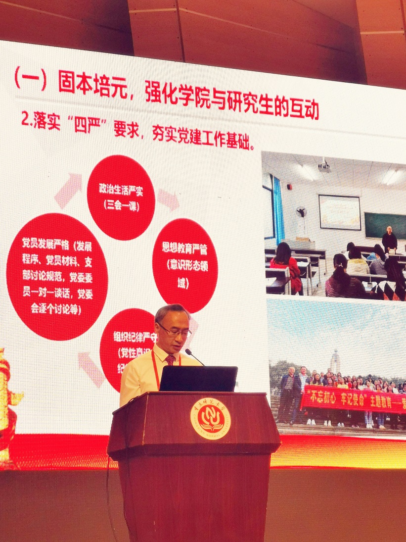 会上,学校选择了四个研究生培养单位作为代表,交流研究生培养经验。我院党委书记刘军代表学院对我院研究生培养工作进行了汇报。刘书记汇报的题目是《坚持旗帜引领,强化“五个互动”,切实提高研究生党建与思政工作新成效》,他从三个方面进行了汇报。首先,他介绍了我院学位授权点、研究生人数构成和导师情况等基本概况。其次,他着重介绍了“五个互动”的主要内容和运行机制:一是固本培元,强化学院与研究生的互动;二是四德并重,强化学院与导师的互动;三是深耕精培,强化导师、班主任与研究生的互动;四是朋辈互喻,强化研究生与研究生之间的互动;五是共享成长,强化研究生与本科学生的互动。最后,刘书记从我院学生政治思想素质不断提升、党员示范作用充分发挥、责任担当意识显著增强、人才培养成效更加彰显四个方面介绍了我院研究生培养工作的主要成效。刘书记的发言精彩纷呈,受到与会人员的高度肯定。