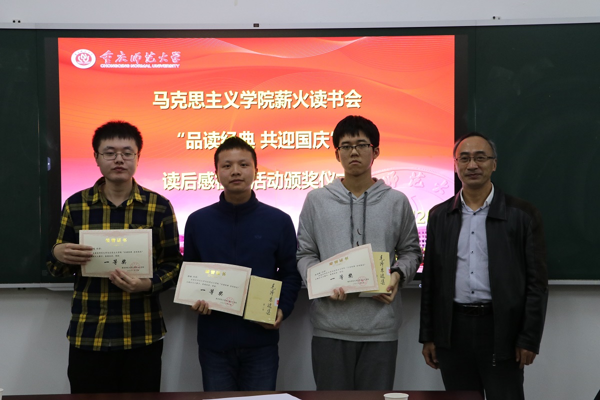 接下来进入第二部分——“品读经典 共迎国庆”征文颁奖仪式。学院党委书记刘军、党委副书记方敏、刘忠荣副教授为本次征文获奖同学颁发了荣誉证书、奖品。据悉此次征文活动中共有四十五名同学参与投稿,其中一等奖三名、二等奖六名、三等奖八名、优秀奖十一名。本次征文活动与读书分享会形成了呼应,阅读不应止于输入的初步阶段,而是在书写读后感的基础上对知识进行吸收、联想、输出等思想活动,从而提升了自身思维的逻辑性、写作的创造性。