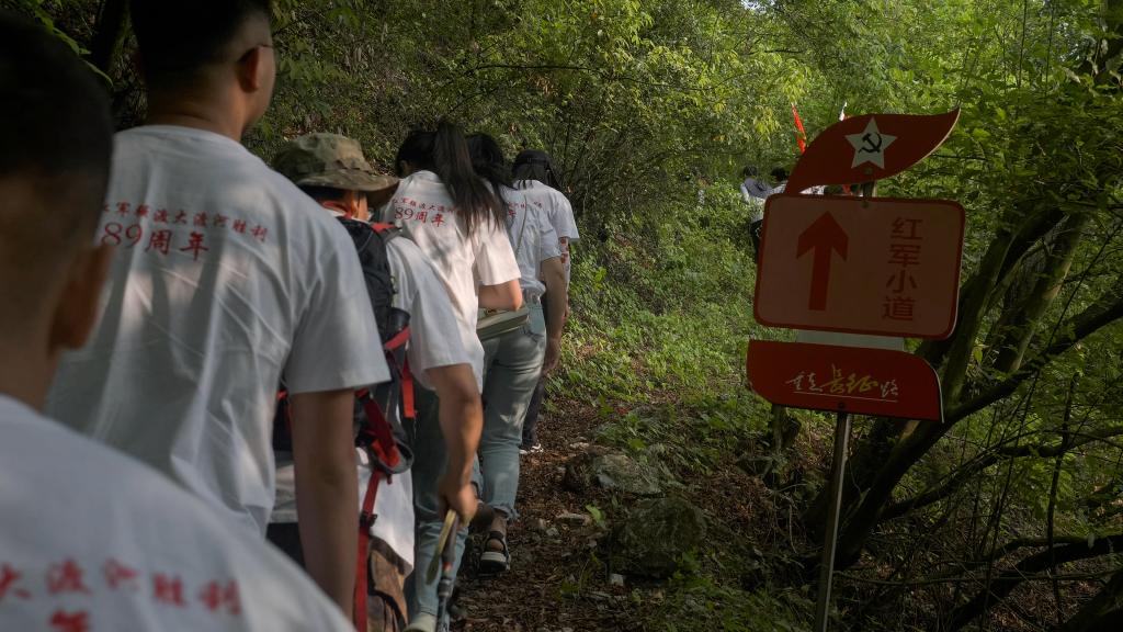 活动伊始,师生们与大渡河连、石棉县青年团员、安顺场大渡河勇士突击队等携手徒步重走长征路。沿着当年红军走过的青石土路,穿越山林壁、登顶马鞍山,徒步四公里,历时1小时,人均7538步,身临其境地体验到当年红军“后有国民党敌军,前有川军,部署夜袭安顺场”的紧迫感,感受到红军不畏困难、勇往直前、不怕牺牲的精神。
