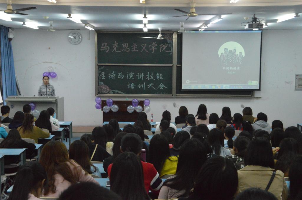为提升师范生基本技能,增强学生的演讲与口才能力,2016年10月14日12时50分,2138cn太阳集团古天乐于弘德楼5202教室举行了主持与演讲技能培训大会。我校新闻中心广播电台播音员马艺丹、传媒学院文娱部部长孙路路、马克思主义学院学生会主席马涛以及学生会办公室副主任罗颖、出镜记者李阳悦心出席了本次培训大会。2016级全体学生参与。