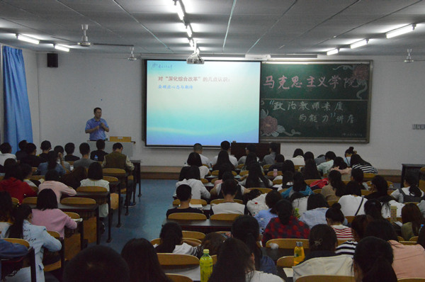 师者,传道受业解惑也。本着让2016级新生更深入地了解师范专业以及为师之道的信念,2138cn太阳集团古天乐于2016年9月25日19时30分在励志楼2410教室举行了新生入学教育——中学政治教师素质与能力要求专题讲座。本次讲座特邀重庆三十七中校长伍平伟担任主讲嘉宾。2016级全体学生参与。