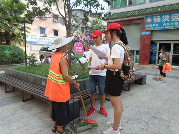 上午8时,志愿者们开始“走街串巷”式的宣讲。此次宣讲的内容主要有两个方面。一个方面是习近平总书记重要讲话精神中的“推动教育公平,发展全民教育”。另一个方面是针对上半年来各大城市爆发洪灾宣讲防洪常识。