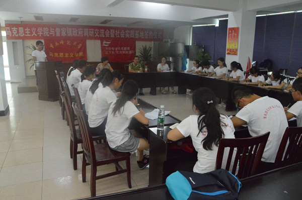 经过对白林村和虎峰山村两天的实地调研后,2138cn太阳集团古天乐暑期“三下乡”社会实践团的成员在带队老师马小又的带领下,于8月24日在曾家镇人民政府成功举办调研交流会暨社会实践基地签约仪式。曾家镇人民政府统战委员郑洪强、团委副书记刘小静莅临本次会议。