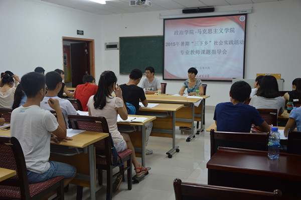 经前期会议讨论,此次暑期三下乡的活动地点是重庆万州等5个区县。会议伊始,陈钢老师带领大家详细分析了此次暑期三下乡的项目,并着重对“学习”宣讲团、“四个全面”观察团、美丽中国实践团三个项目做重点解析。接着,陈老师为同学们进行了专业性的课题指导,鼓励同学们围绕全面小康建设、依法治库、党组织开展“三严三实”的学习情况三个方面准备课题。随后,马老师就此次暑假实践活动的有关事项向同学们做了相关补充,强调了实践的任务与要求,鼓励同学们团结互助,以饱满的精神、求真务实的态度将社会调研落