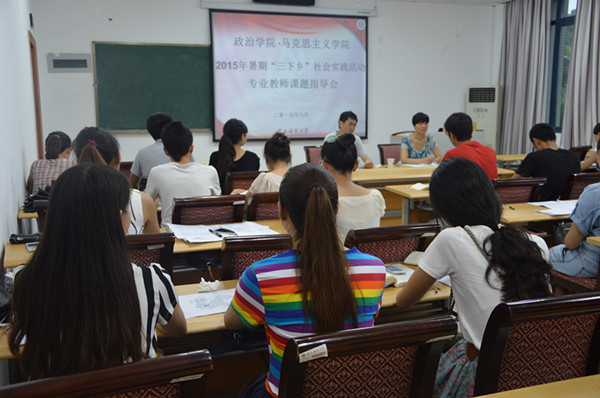 为贯彻落实习近平总书记系列重要讲话精神,引领广大青年学生“勤学、修德、明辨、笃实”,树立和践行社会主义核心价值观,落实重庆市委市政府的相关会议精神,太阳集团2138结合学校实际,部署了2015年暑期“三下乡”社会实践活动。政治学院积极响应学校号召,组织筹划具体实践项目和课题,并于2015年6月29下午14时,在学院楼201举行了“三下乡”课题调研专业指导培训会。培训会由政治学院团总支书记马小又主持,陈钢老师应邀出席并担任专业指导老师,2015年暑期“三下乡”的全体同学参与了此次培训会。