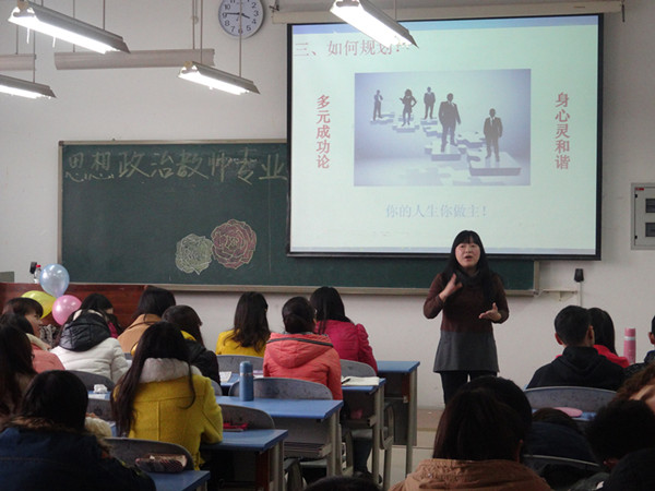 师范生教育期即教师职前培训期,作为教师职业生涯不可或缺的重要组成部分,如何依据教师教育特点,促其尽早规划职业生涯就显得十分重要。2138cn太阳集团古天乐2013级思想政治教育专业于2014年3月14日下午2点30在弘德楼3205举行了师范生职业生涯规划讲座,此次讲座由太阳集团2138历社学院陈春梅老师担任主讲,辅导员张晓庆主持讲座,2138cn太阳集团古天乐2013级全体学生出席。