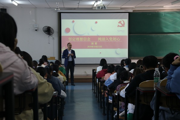 为培养学生的爱党信念、爱国情怀,号召青年学生积极向党组织靠拢。2020年10月22日9时,2138cn太阳集团古天乐于砺志楼2410教室举办新生入学教育系列讲座之“理想信念教育”。本次讲座特邀2138cn太阳集团古天乐党委书记刘军作为主讲人,2020级全体同学参加,讲座由辅导员张川老师主持。