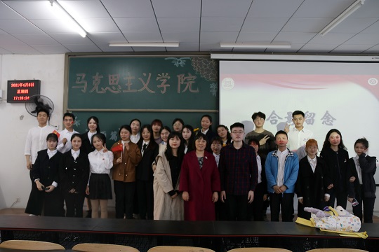 评委与选手合影后,朗诵比赛圆满落幕。本次比赛给学生提供了自我展示和学习交流朗诵技巧的平台,引导学生要知史爱党、知史爱国,增强了守初心、担使命的责任感,进一步推进了学院学风建设、营造了全院爱党爱国的良好氛围。