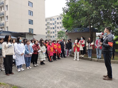 集合完毕后,到场领导对本次疏散演练活动进行评述,向同学们强调了开展消防演练、提高安全意识的重要性,并进行了消防知识讲解。接着,马小又老师带领学院同学列队前往后山空地处进行油盆灭火演习。