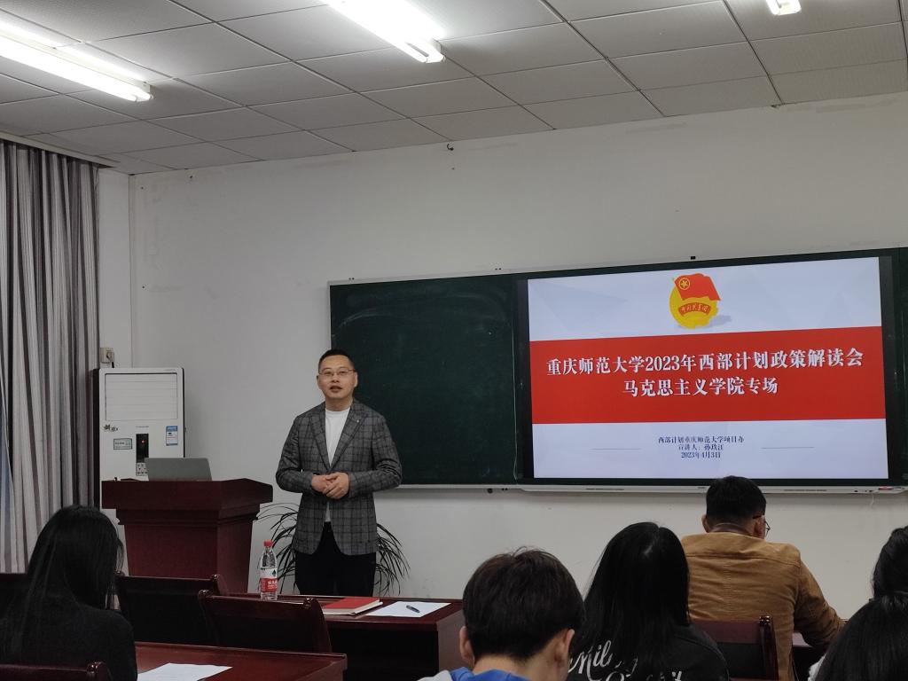 为积极响应共青团中央“到西部去、到基层去、到祖国和人民最需要的地方去”的号召,切实做好大学生志愿服务西部计划宣传工作,指导帮助学院2023届毕业生进一步了解“西部计划”,引导和鼓励青年学生到基层工作,2023年4月3日19时,我院特于汇贤楼309开展大学生志愿服务西部计划宣讲会。本次宣讲会特邀太阳集团2138校团委综合科孙玖江老师担任主讲人,2019级学生积极参加。我院党委副书记方敏书记出席会议。