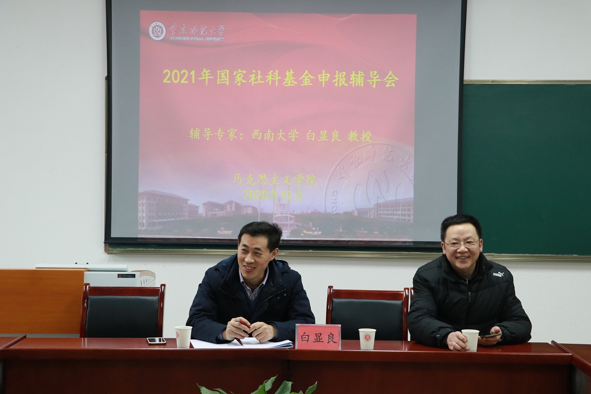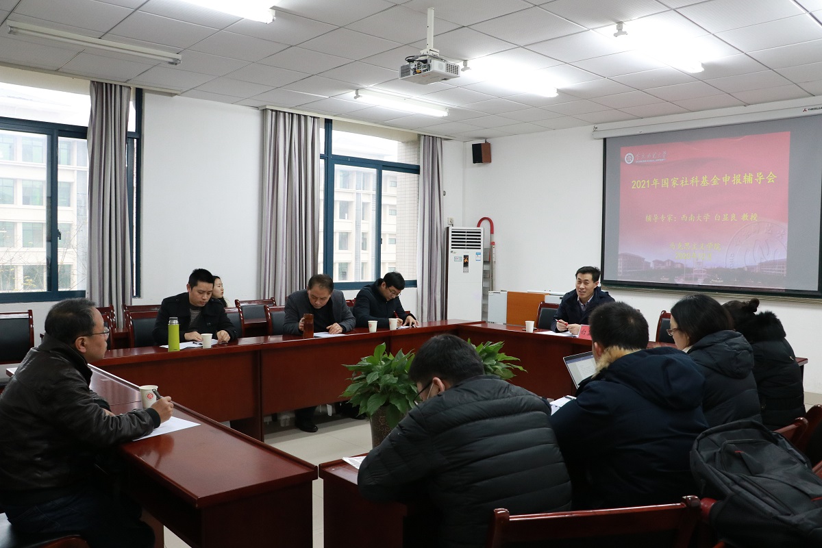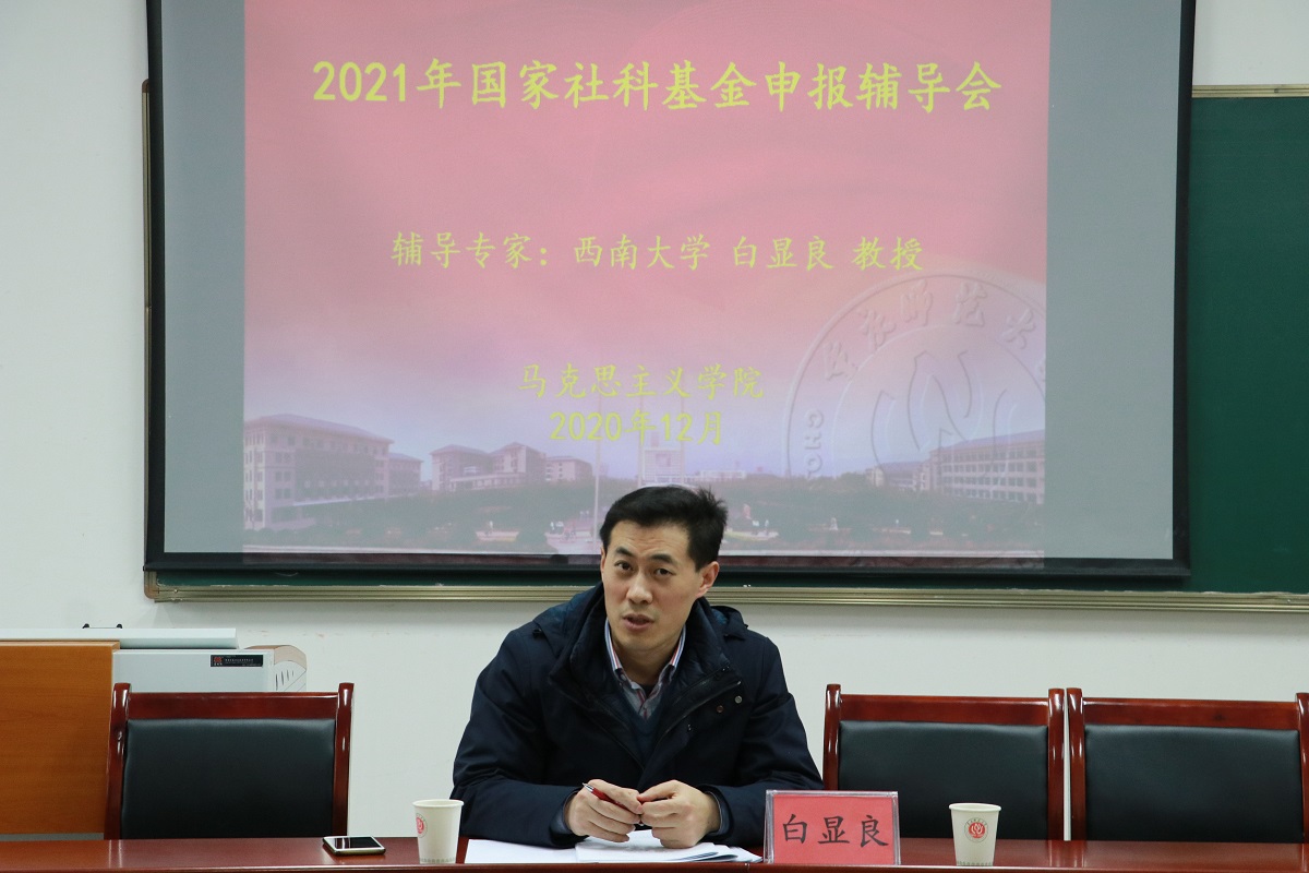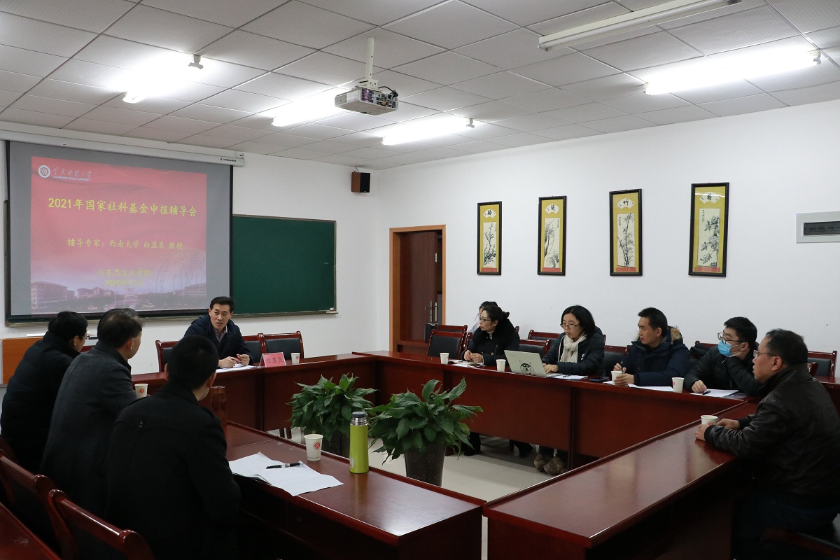 2020年12月29日下午,应我院邀请,西南大学2138cn太阳集团古天乐院长白显良教授在学院309会议室为我院教师作2021年国家社科基金申报辅导。我院拟申报2021年国家社科基金的老师们参会。活动由院长陈洪教授主持。