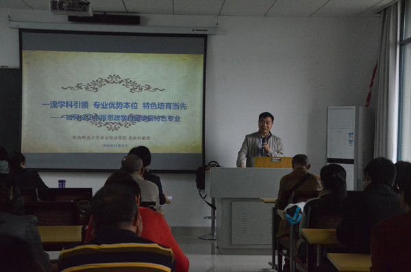 接着,袁教授与学院教职工分享了思想政治教育国家级特色专业建设的基本情况和陕西师范大学的一些探索和经验,介绍了陕西师范大学2016级思想政治教育培养方案(师范类、非师范类),并对全国思想政治教育专业历史和当前全国思想政治专业的发展态势作出分析。
