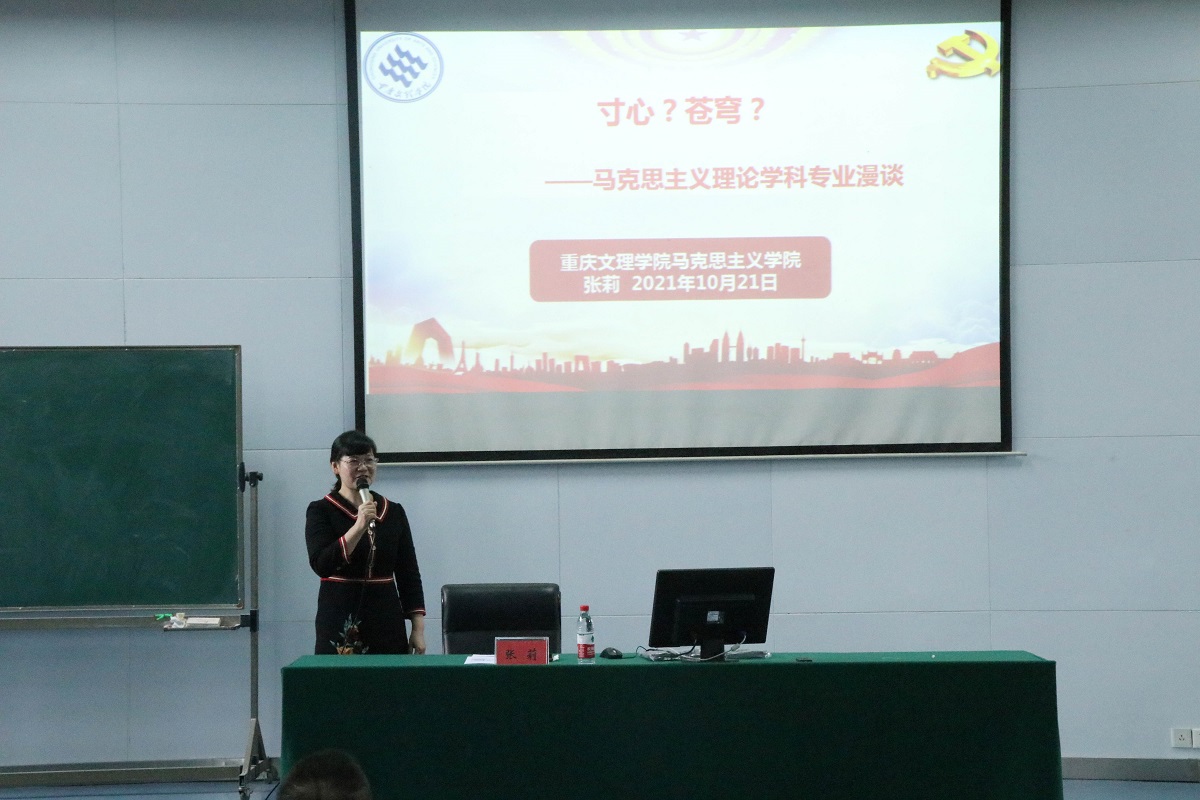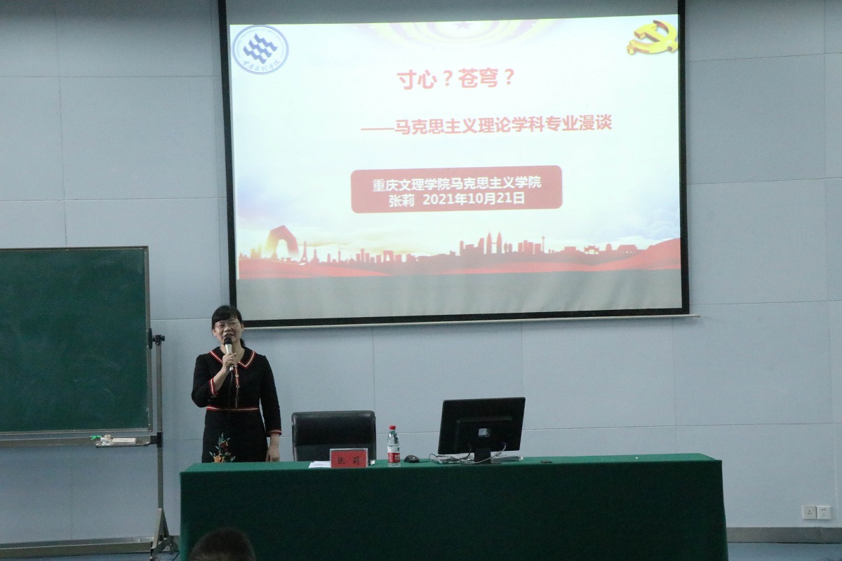 为进一步增强我院学生对马克思主义理论学科的理解认识拓宽学生视野,2021年10月21日下午3:00我院邀请校友、重庆文理学院副院长张莉教授在陈性初学术报告厅主题为“寸心?苍穹?——马克思主义理论学科专业漫谈学术讲座。学院教师代表、本科生代表及全体2021级研究生共同聆听了此次讲座。讲座由我院党委副书记方敏主持。