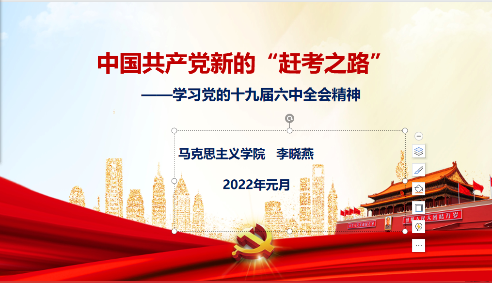 2022年元月17日下午,我院全体教职工在学院106会议室进行了集中政治理论学习。本次学习以党委书记讲微堂课方式进行,由党委书记李晓燕同志主讲党的十九届六中全会精神。