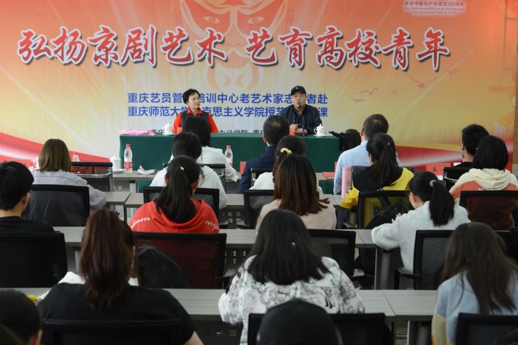 4月22日下午,我院特邀重庆艺员中心文艺志愿艺术团京剧艺术家孙志芳(国家一级演员)、张志凌(国家二级演员)在我校三春湖报告厅讲授艺术思政课。学院党委副书记方敏、学工辅导老师及学生近150人参加。