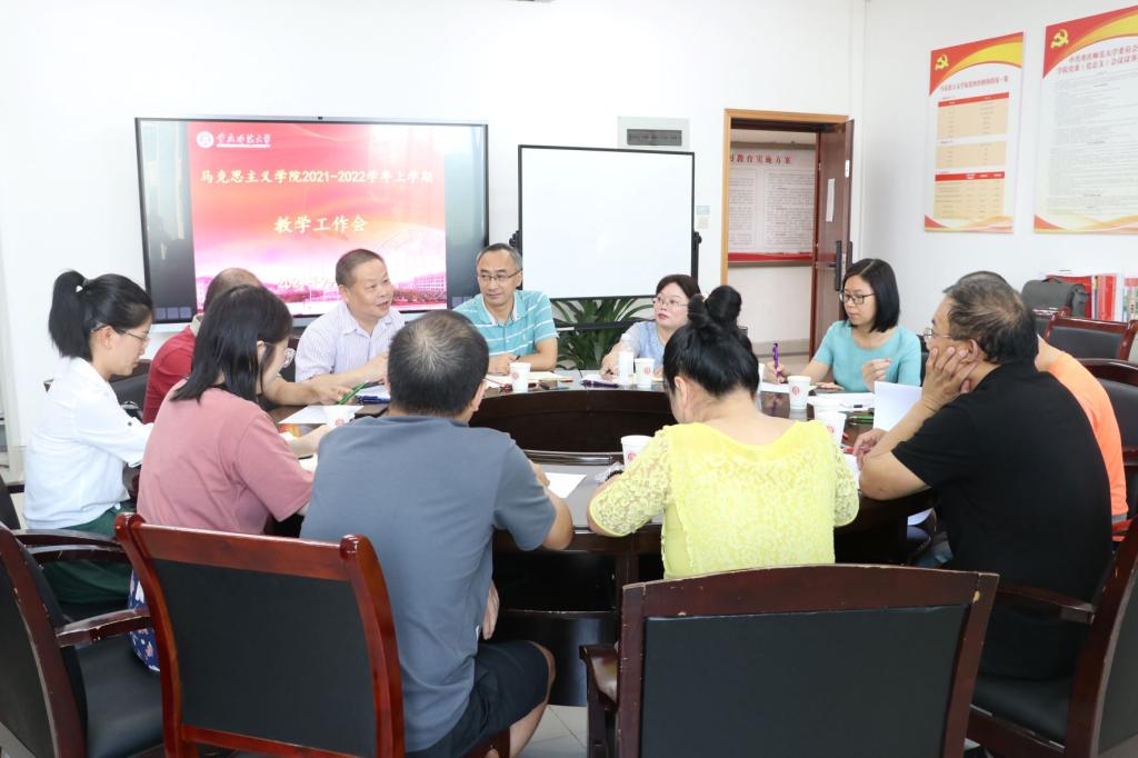 为进一步推动本科教育教学改革,切实加强思想政治教育国家级一流本科专业建设和进一步提高思想政治理论课教育教学质量,2021年9月23日15时,我院于汇贤楼301会议室召开本科教学工作会。学院党委书记刘军、副院长况明安、系部教研室主任、教科办相关人员参与本次会议。会议由副院长况明安主持。