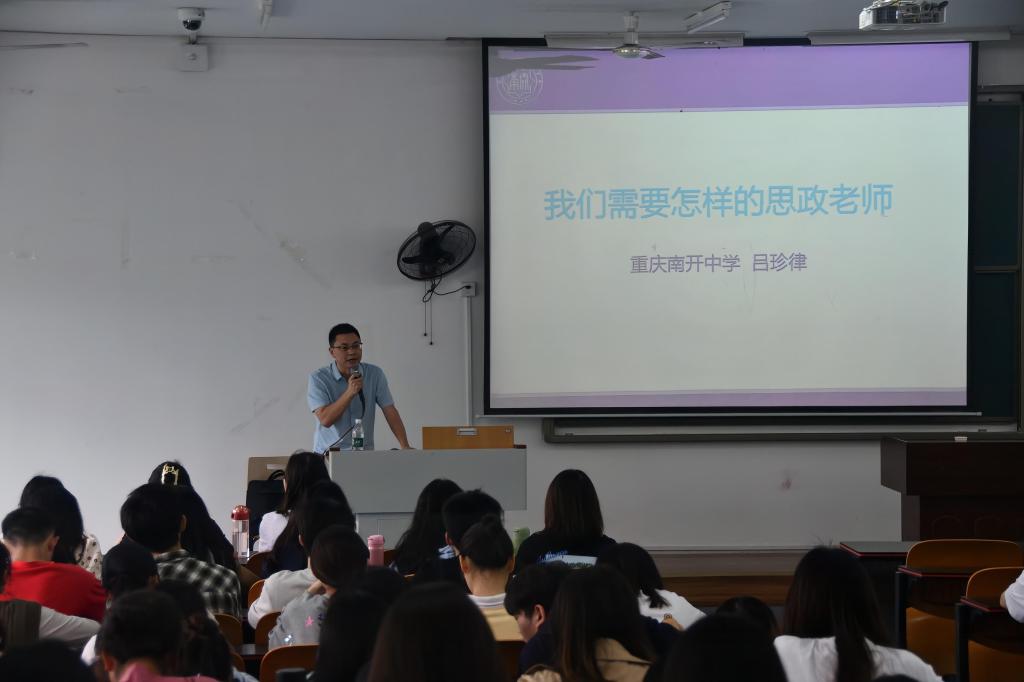 本次讲座特邀重庆市南开中学高级教师、教务处主任、重庆市政府教学成果奖获得者、重庆市五一劳动奖章获得者吕珍律老师为我院2020级思想政治教育专业本科学生带来一场以“我们需要怎样的思政教师”为主题的专题讲座。
