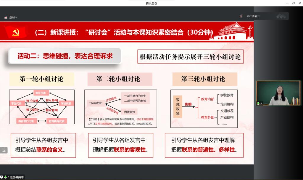 郑瑜老师对选手们在说课中展现出的亮点进行了充分肯定并针对说课教学提出五点建议:一是突出教学目标,以一节课为整体进行教学设计,以系统的形式进行总结升华;二是教学设计与教学教点、时政、教育改革热点相结合,善用议题式教学,一案到底、条理清晰;三是突出课件的直观性,课件要制作精美,图文并存且导航清晰;四是关注课题后的意图,注重教学设计与教学方法;五是强调教学课题的总结与升华,积极进行教学反思,达到教学目标。