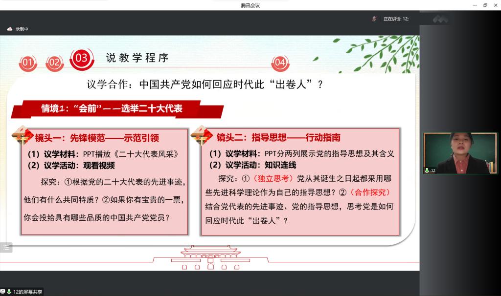 比赛伊始,14位选手在主持人介绍比赛规则、评分细则后按照抽签顺序轮流进行展示。选手们从教材分析、学情分析、教学方法、课堂设计、板书设计和教学反思等方面进行详细阐述,准备充足、认真严谨、匠心独运,充分展现了我院师范生良好的专业素养。其中,7号选手以《中国特色社会主义进入新时代》为题展开说课,课程以情境展开,重点明确,层层递进,生动有趣,课堂设计合理,语言表达流利顺畅。10号选手选题为《我国的社会保障》,说课过程语言清晰,课堂导入方式独特,教学思路明朗、深入浅出,教学设计符合学生认知规律,表现出选手较强的教学设计能力。