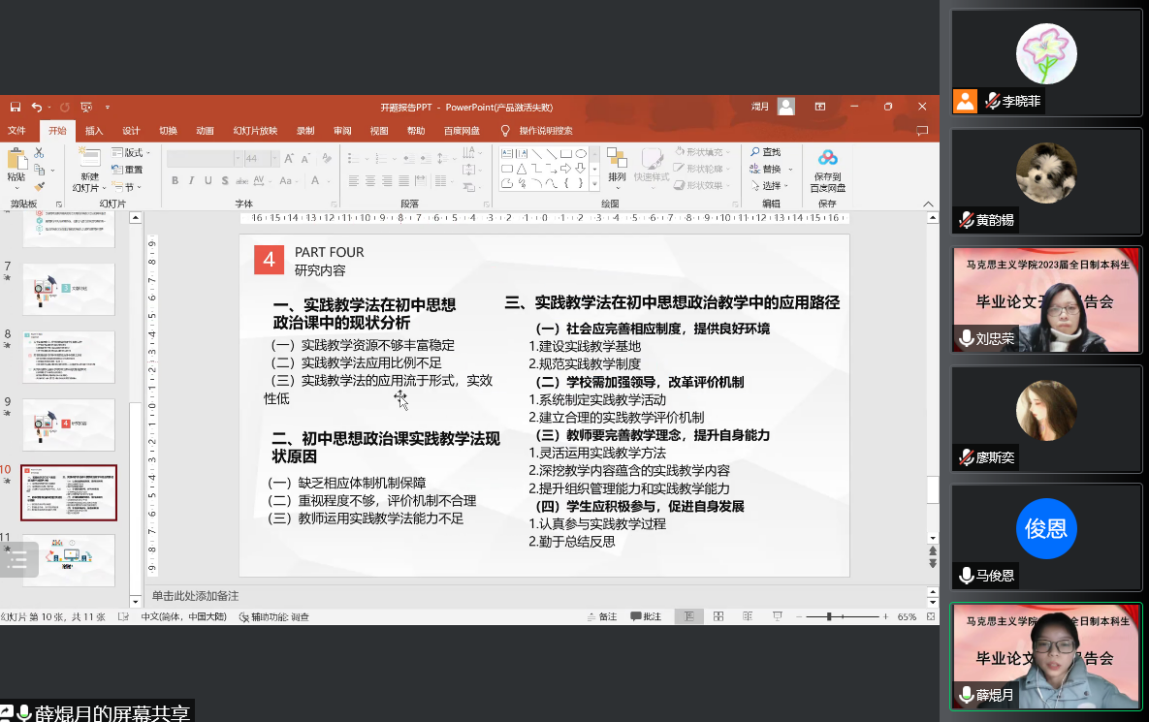 本次本科生毕业论文开题报告会将2019级思想政治教育专业194名学生分为22个小组同时进行。开题报告会严格按照规定流程进行。首先,各组本科生根据顺序依次展开陈述,陈述内容包括论文选题、研究内容、研究框架及时间安排等,陈述时长为3-8分钟。陈述完毕后,答辩委员会老师依据本科生的开题报告及陈述内容进行提问,并针对性给出中肯、可行的修改意见。每位本科生认真回答导师提出的问题,聆听并详细记录导师们提出的宝贵建议。最后,答辩委员会根据本科生的论文选题、框架设计、研究方法、可行性分析等综合情况进行集中评议,最后由各组答辩委员会主席分别对本组开题情况进行简要总结并公布开题结果。