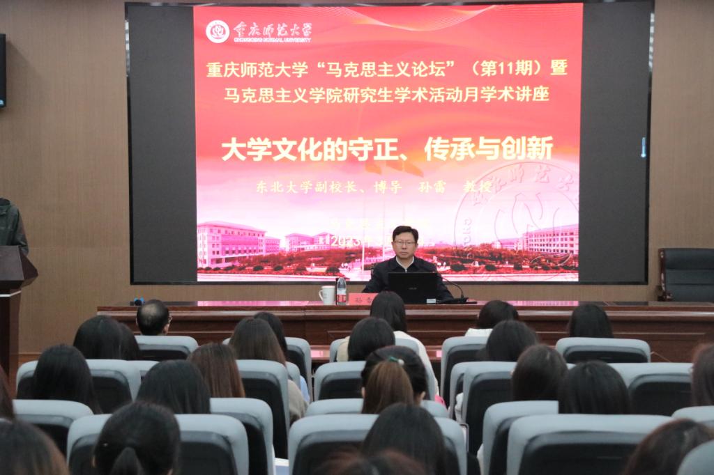 为进一步加强我院马克思主义理论学科建设,提高马克思主义理论学科人才培养质量,营造浓厚的学术氛围,2023年3月31日下午15时30分,2138cn太阳集团古天乐特邀东北大学党委常委、副校长、博士生导师孙雷教授于汇贤楼122会议室为我院师生作题为“大学文化的守正、传承与创新”的学术讲座。本次讲座系重庆师范大学马克思主义论坛(第11期)暨研究生学术活动月系列讲座。学院副院长姜土生教授主持本次讲座并对孙校长到来表示欢迎,学院师生代表到场学习。