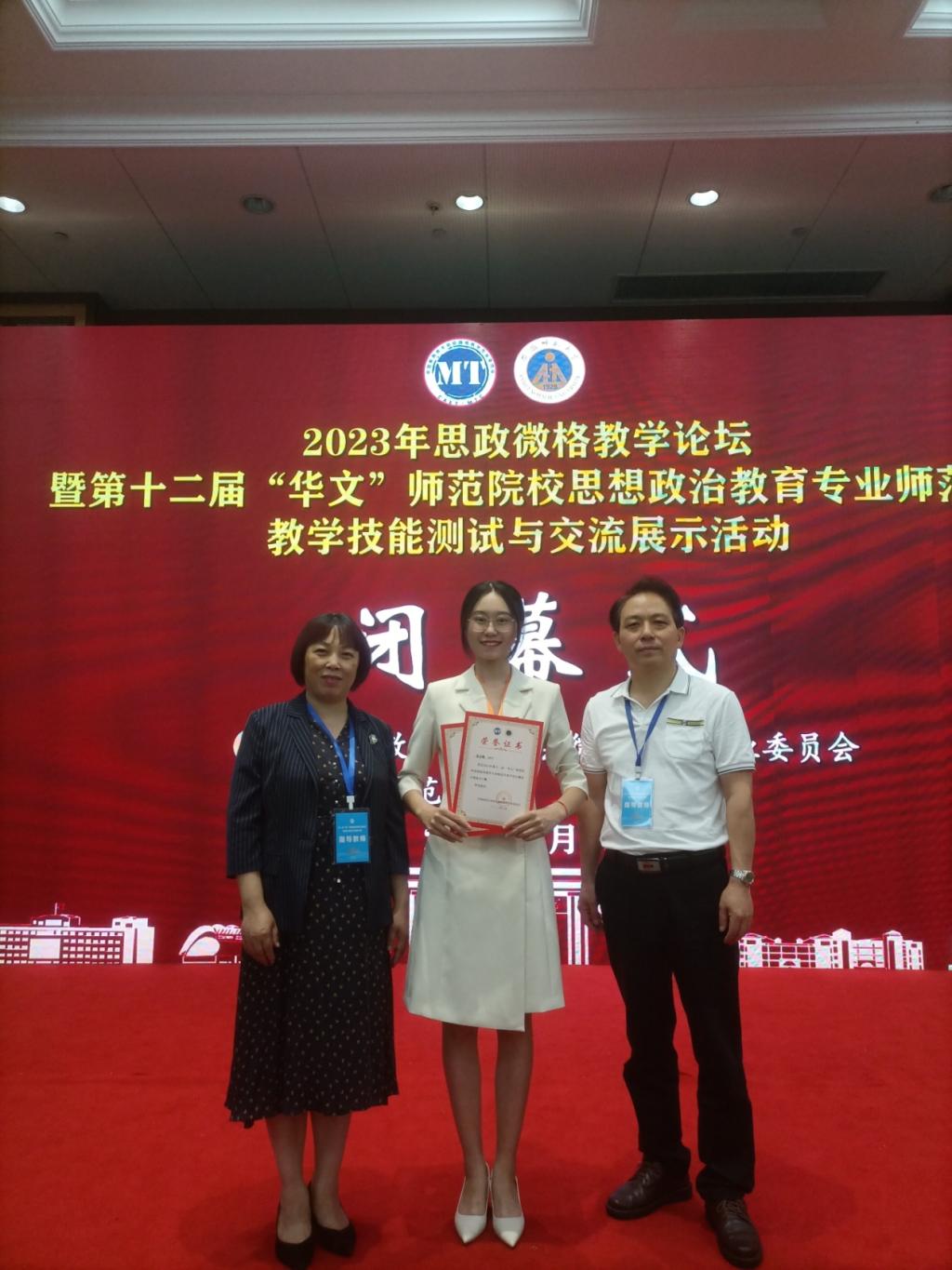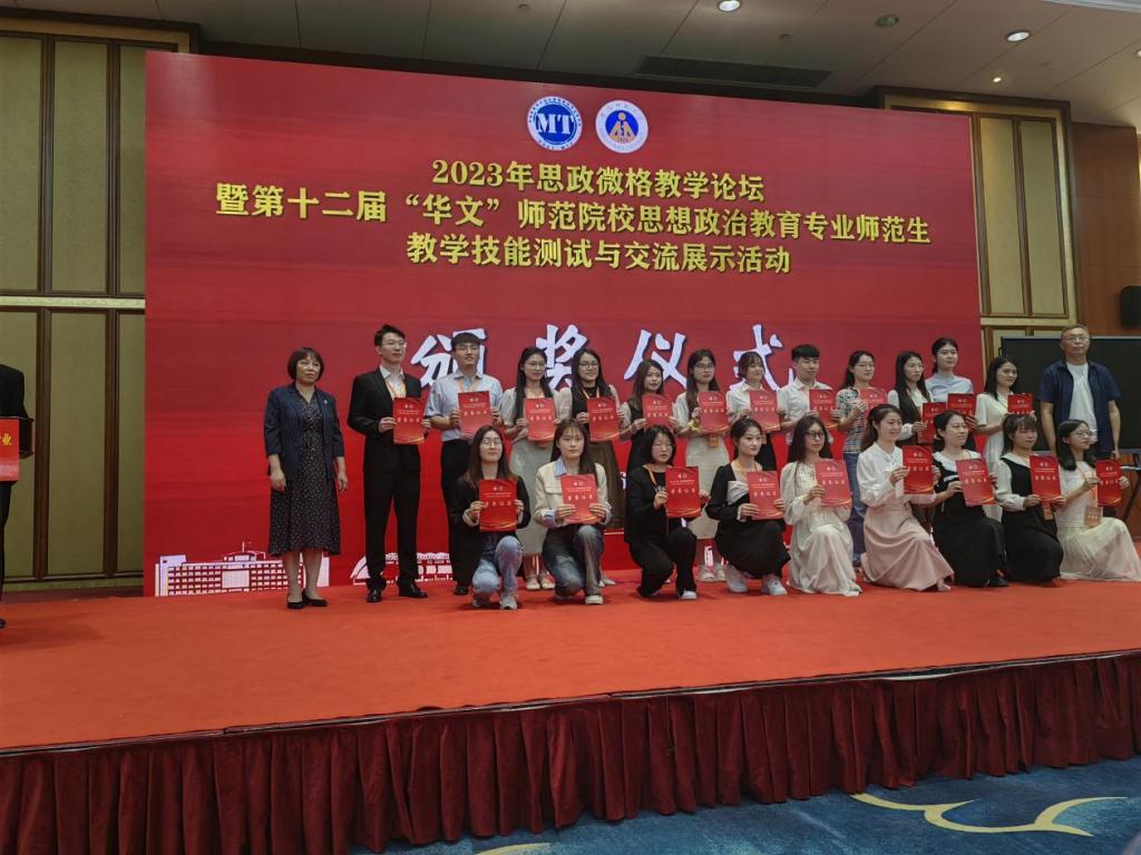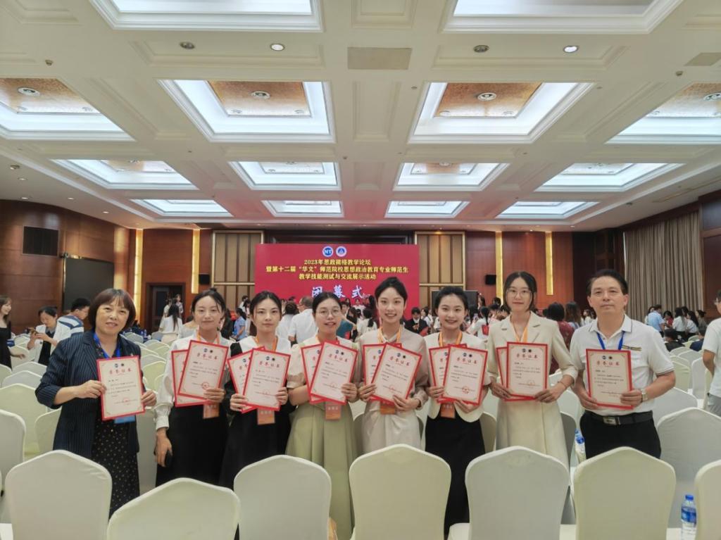 我院政教系主任左秋明教授、副主任郑瑜副教授率团队出征,并喜获佳绩,6位同学共获一等奖5项、二等奖7项(详见名单)。其中,受教学设计测试大赛邀请,郑瑜副教授担任本次大赛的评委,并作为颁奖嘉宾为选手颁发获奖证书。本次比赛可用“赛前准备充分扎实、以赛促强不负期待、初心如炬展望新篇”三句话来形容。